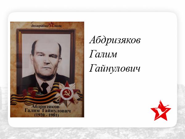 Абдризяков Галим Гайнуллович был призван Енисейским обьедененным городским военкоматом Красноярского края.Национальность Татарин.Призван к строевой службе 10 Октября 1940 года.