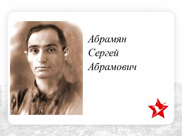Абрамян Сергей Абрамович был призван Бакинским ГВК в октябре 1934 г.к строевой службе и зачислен в пятый автобронебатальон шофером с октября 1934 по сентябрь 1936 г. Уволен в запас 1936 г. Призван по мобилизации Джержинского ДЗРЖ РВК г.Баку в июне 1941 г. Был зачислен в 48-ой инженерно-противохимический полк МВД и работал там шофером до ноября 1945 г. Был демобилизован в ноябре 1945 г.