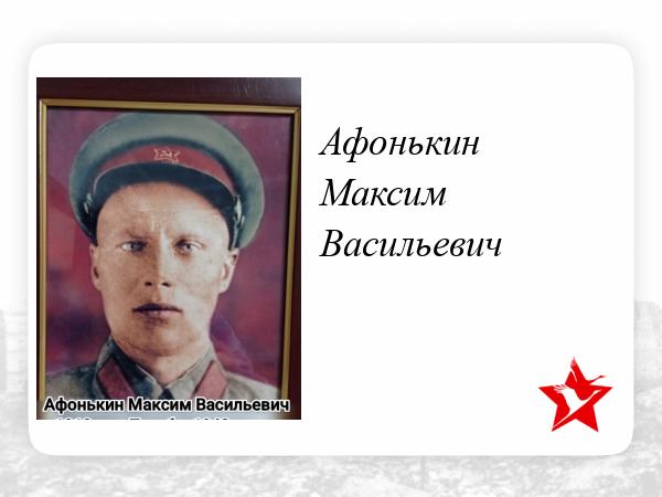 Рядовой Афонькин Максим Васильевич, призвался на фронт в 1941 году в р. Казахстан Акмолинской области д. Филишовка. Служил в 326 Стрелковой дивизии .Погиб 23 февраля 1943г. Похоронен в Калужской области. Думиничский район.д. Пустынка.
