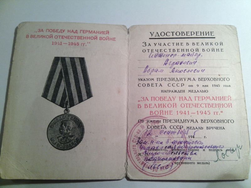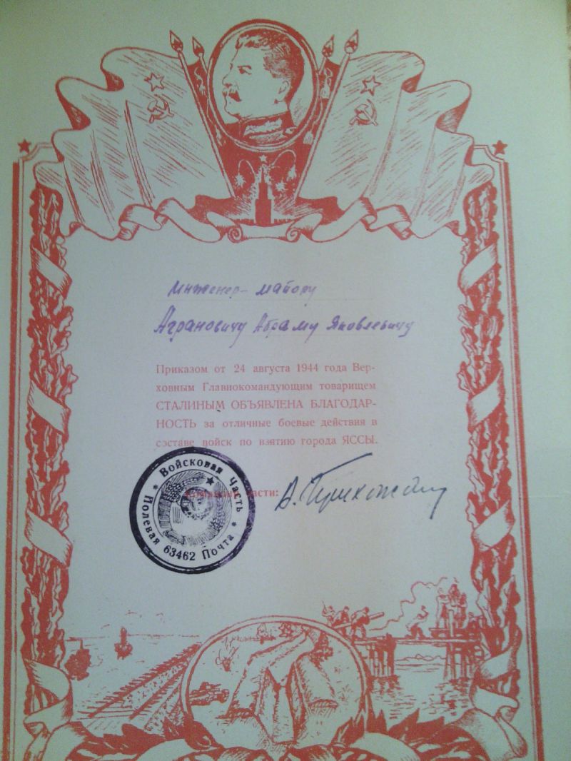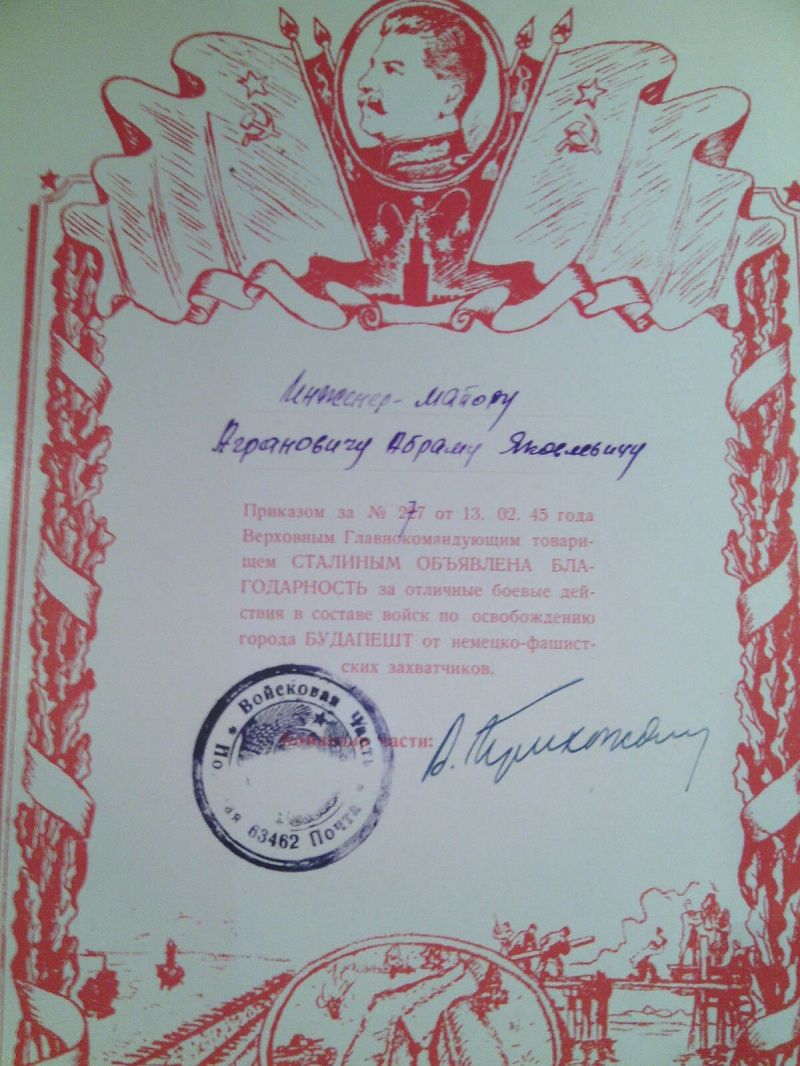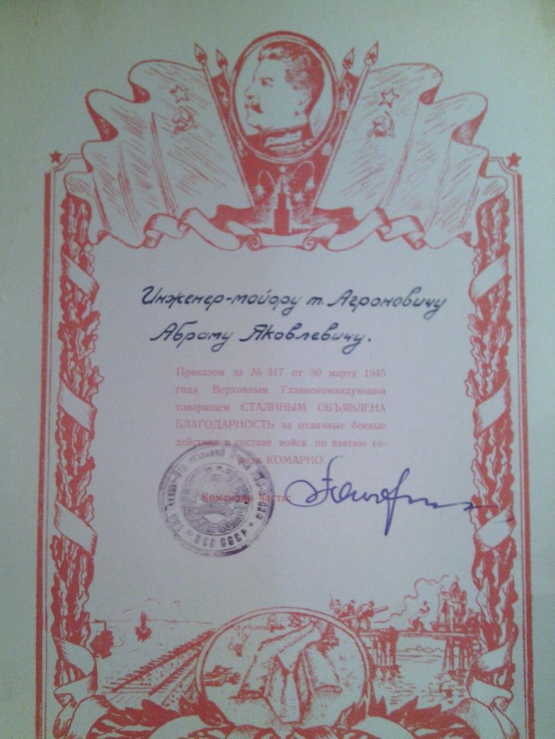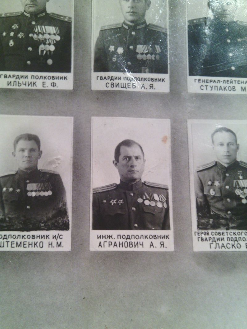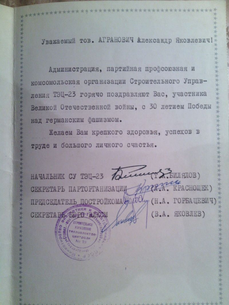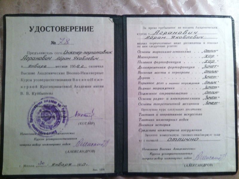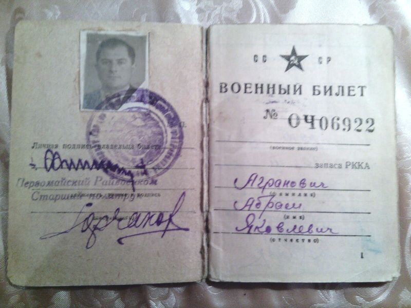 Агранович Абрам Янкелевич, еврей, родился в июле 1914 г в г. Золотоноша УССР. Окончил среднюю школу в 1930 г. в г. Москве. С 1931 г. начал трудовую деятельность в Электросети Мосэнерго, одновременно учился в Московском политехническом техникуме железнодорожного строительства им. А.А.Андреева, который окончил в феврале 1935 г по специальности «промышленного и гражданского строительства». До марта 1941 г работал на энергетическом строительстве ТЭЦ-11 в г. Москве. С марта 1941 г и по июнь 1953 г служил в рядах Советской Армии в инженерных частях в должности заместителя и командир части. Воинское звание – инженер-подполковник, далее находился в запасе. С1974 г по 1988 г. работал в строительном управлении ТЭЦ-23 (ранее ТЭЦ-11) в г. Москве в должности начальника строительного участка. За время работы внес ряд рацпредложений, неоднократно отмечался благодарностями и ценными подарками.