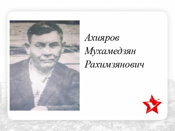 Старший сержант Ахияров получил боевой приказ: с группой сапёр-разведчиков 19.09.1943 года днём выдвинуться к реке Хмара у села Сергеевское и произвести инженерную разведку реки с целью пропуска танков в брод. Старший сержант Ахияров, выдвинувшись вперёд наших боевых порядков, продвигался вперёд, противник, заметив их, повёл ураганный пулемётный огонь по разведчикам, старший сержант Ахияров выполнил приказ, сам уничтожил пулемётный расчёт противника и вырвался к мосту, в это время Ахияров был тяжело ранен, но он не покинул группы, разведал брод и, прикрываясь, огнём отошёл в укрытие, где он потерял сознание, бойцы его группы доставили Ахиярова в медпункт.
