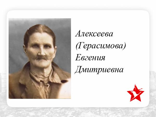 Алексеева (Герасимова) Евгения Дмитриевна родилась в 1879 году в деревне Курочкино Свияжского уезда Казанской губернии Российской империи. Беспартийная. Домохозяйка. Проживала в городе Рузаевка Мордовской АССР до 08 мая 1937 года. Проживала в городе Кинель Куйбышевской области с 08 мая 1937 года по 07 марта 1939 года. Проживала в городе Уфа Башкирской АССР с 07 марта 1939 года по 19 ноября 1944 года. Во время Великой Отечественной войны 1941-1945 гг. трудилась надомницей и изготавливала военное обмундирование (зимнии и летнии маскировочные комбинезоны, руковицы, снегоступы и т. д.) в городе Уфа Башкирской АССР. Умерла 19 ноября 1944 года.