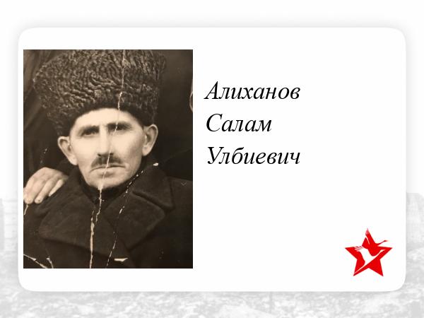 Алиханов Салам Улбиевич, уроженец ЧИАССР. Родился в 1912 г. В многодетной семье. В 1941 году был призван в Красную армию в полк Под командованием Висаитова Сакка ,умер в 1988 году.