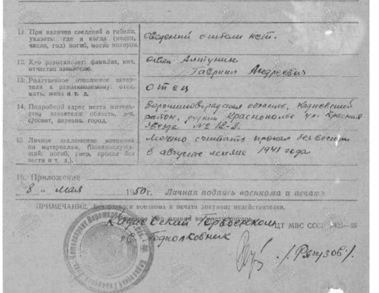 Извещение отправлено его отцу - Алтунину Гавриилу Андреевичу, проживающему по адресу: Ворошиловградская область, Кадиевский район, город Краснополье, улица Красная звезда, дом 12/2.