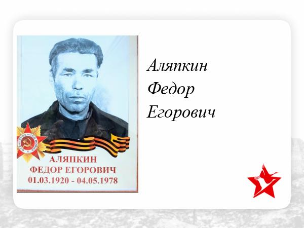 Аляпкин Фёдор Егорович был сначала призван на срочную службу,а от туда его сразу забрали на фронт.Там он попал в дивизию под командованием генерала Власова,который сдал наших солдат немцам.Потом попал в плен,и был в плену пока наши не освободили их...Далее генерал Власов был признан изменником Родины и казнен,а тот кто служил под его руководством отправлен в кунц-лагерь.Федора Егоровича в том числе отправили в Магадан,там он отсидел 10 лет.После кунц-лагеря освободился и приехал на Родину.