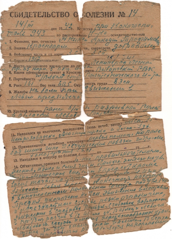 Мой дед, Аникей Аркадий Трофимович, студент Ленинградского Политехнического Института им. М.И. Калинина, имея "бронь" ушел на фронт добровольцем в июле 1941 года. Рядовой красноармеец. В марте 1942 года в бою под Петрозаводском получил ранение разрывной пулей. В результате ранения получил инвалидность 2 группы.