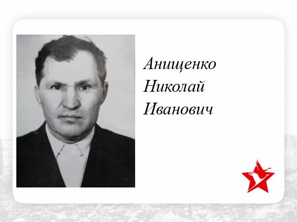 В 17 лет ушел в партизанский отряд, затем с частями красной армии ушел на фронт. Принимал участие в освобождении Белорусии и Восточной Пруссии с апреля 1943 по 1944 год. Командир отделения 1233 стрелкового полка. С июня 1944 года по май 1945 год помощник командира взвода 758 стрелкового полка. Награждён орденом Красной Звезды, медалями за отвагу и за победу над Германией. Имел осколочное ранение в плечо. Сержант Анищенко Н. И. демобилизовался в 1949 года.