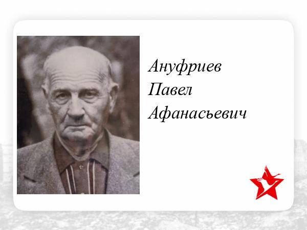 Ануфриев Павел Афанасьевич был призван в 1941 году из села Точильное Смоленского района Алтайского края. Служил в пехоте, затем стал наводчиком на “Катюшах”. Награжден медалями “За отвагу”, «За победу над Германией в Великой Отечественной войне 1941–1945 гг.» и Орденом Отечественной войны II степени.