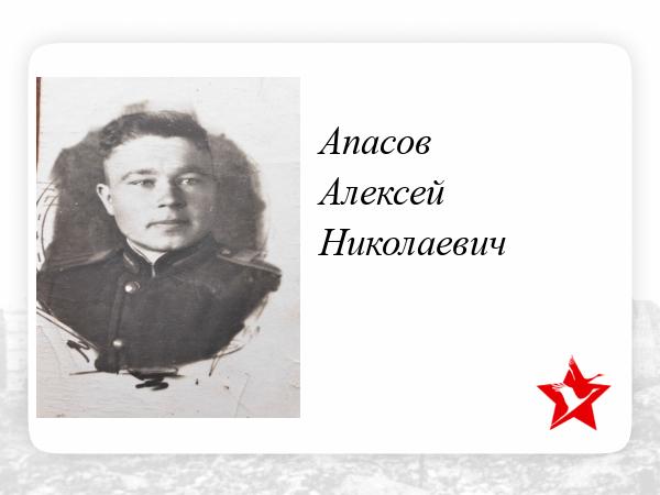 Наш дедушка Апасов Алексей Николаевич родился 27 августа 1922 года в д. Зуево Дедиловского района Тульской области. Учавствовал в ополчении при обороне города Тулы. В марте 1942 года был призван в действующую армию в 157 запасный стрелковый полк в миномётную роту Дальневосточного фронта. В составе 576 стрелкового полка в должности помкомвзвода батареи 45 мм пушек принимал участие в войне с Японией на Дальневосточном фронте. До декабря 1946 года принимал участие в разоружении японской армии в Маньчжурии. За участие в Великой отечественной войне дедушка был награждён: орденом Отечественной войны II степени, орденом Красной звезды, медалями "За оборону Москвы", За победу над Японией", "За победу на Германией".