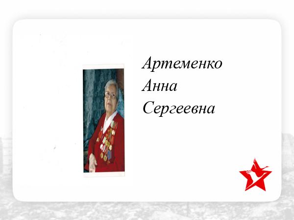 Моя бабушка, Артеменко Анна Сергеевна, родилась в 1914 году в Петрограде. С 1941 по 1942 год находилась в блокадном Ленинграде. Вместе с моим отцом была эвакуирована в Куйбышев. В составе контрразведки 13 Воздушной Армии принимала участие в боях, в Орловско-Курской операции. В 1944 году вернулась в Ленинград. Награждена орденом и медалями.