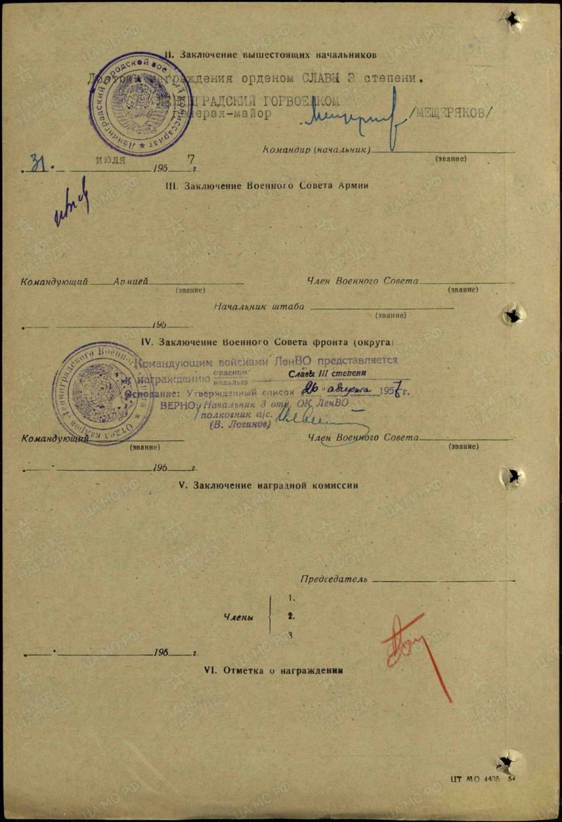 Имел награду за боевые заслуги - "Орден Славы III степени", который ему вручили в Смольном только в 1965 году.