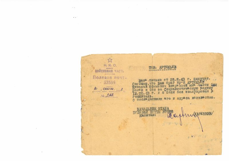 11 сентября 1942 года получил осколочные ранения и находился на излечении в ЭГ-1015.