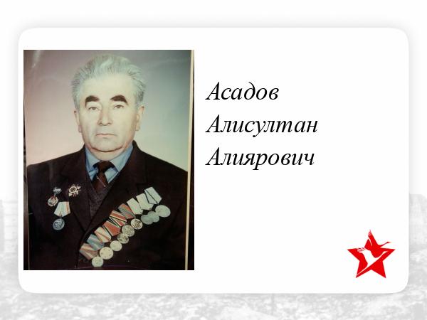 Мой дед, Асадов Алисултан Алиярович, участник ВОВ, боец - 31-ой стрелковой Сталинградской ордена Богдана Хмельницкого 2 -ой степени дивизии. Принимал участие в освобождении городов Крайцбург, Розенберг, Питшен, Ландсберг, Гуттентаг, Лигниц, Любен, Гайнау, Ноймаркт, Милич,Бернштадт, Намслау, Карльсмарк, Тост, Бишофсталь, Острув, Ельс, Яссы, Бунцлау, Кишинев и др, а также форсирование рек Варта и Одер.