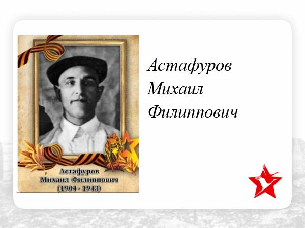 Родился Михаил Филиппович в 1904 году. Был призван на фронт в 1941, был стрелком. Награждён медалью За отвагу. Убит 4 ноября 1943 года в Киевской области.