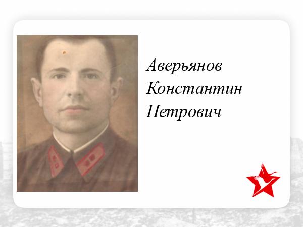 Аверьянов Константин Петрович был призван в 1938, в марте 1942 пропал без вести. Награжден Орденом Красного Знамени. Проходил службу в1174 стрелковом полку, был зам. командира. Сражался героически. Никто не забыт, ничто не забыто, спасибо за Победу такой ценой!