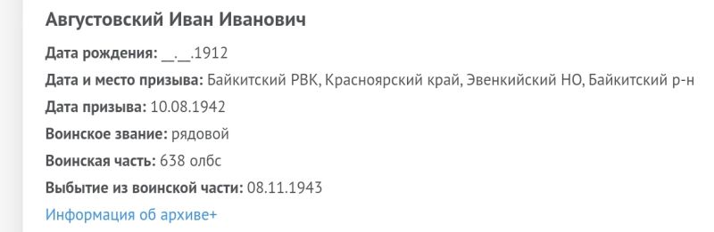 Августовский Иван Иванович, 1912 г. р. Место рождения Красноярский край, Сухобузимский район, с. Новотроицкое. До войны жил в ЭНО, Байкитский район. Призван Байкитским РВК в 1942 году. Сержант. Связист. В/ч 638 олбс., 362 зсп 33 зсд. Отец Августовский Иван Сидорович.