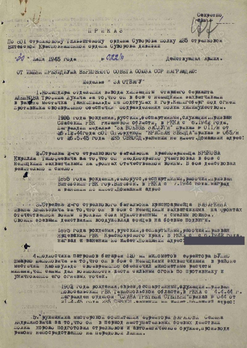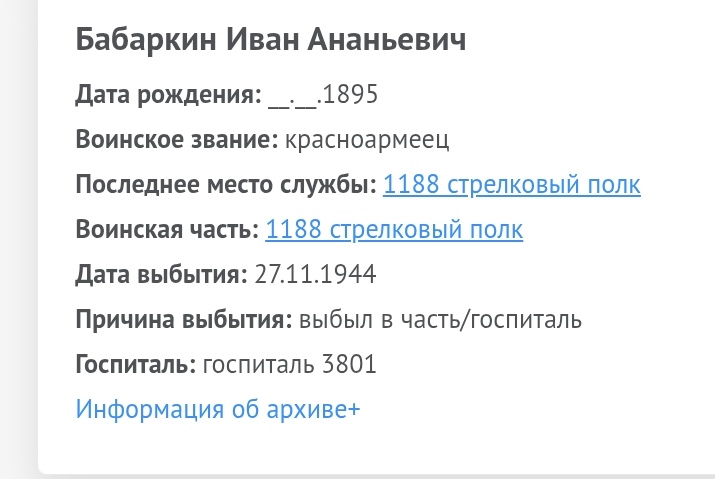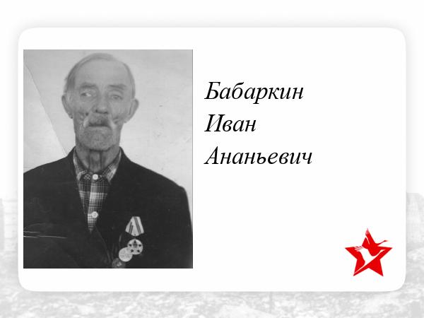 Бабаркин Иван Ананьевич, 1895 г. р. Место рождения Красноярский край, Енисейский район, д. Ярцево. Призван Енисейским РВК в 1942 году. Красноармеец. Стрелок. В/ч 801 сп 235 сд., 1188 сп 357 сд. Участник штурма Кёнигсберга. Ранен в ноябре 1944 года, ЭГ 3801. Награждён медалью За отвагу, медалью За Победу над Германией в Великой Отечественной войне 1941-1945 гг. Комиссован после тяжёлой контузии в апреле 1945 года.