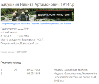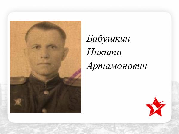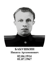 Бабушкин Никита Артамонович родился 2 апреля 1914 года в Башкирской АССР, Покровский район, Вовковский сельсовет. Призван Благовещенским РВК Башкирской АССР в РККА в 1936 г( с22 лет).