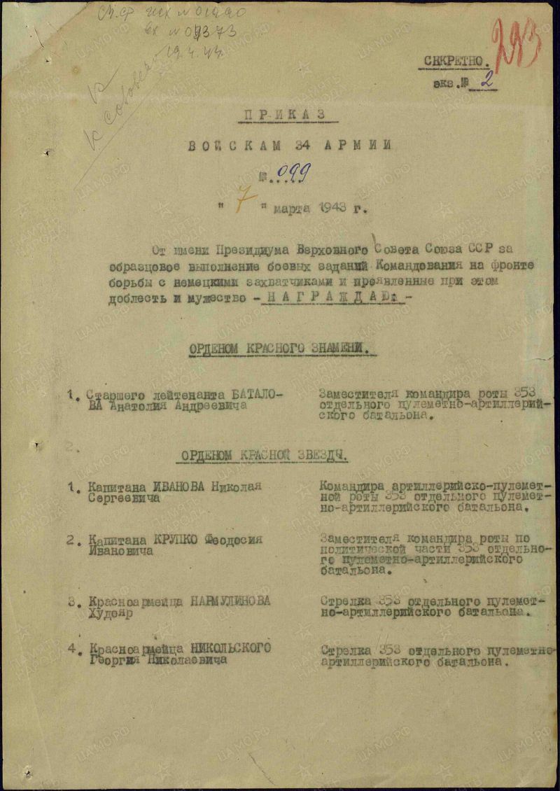 7 марта 1943 года ПРИКАЗОМ ПО ВОЙСКАМ 34 АРМИИ