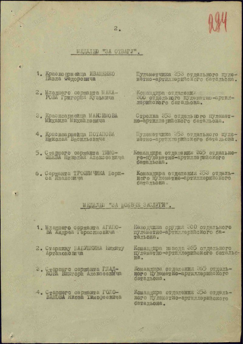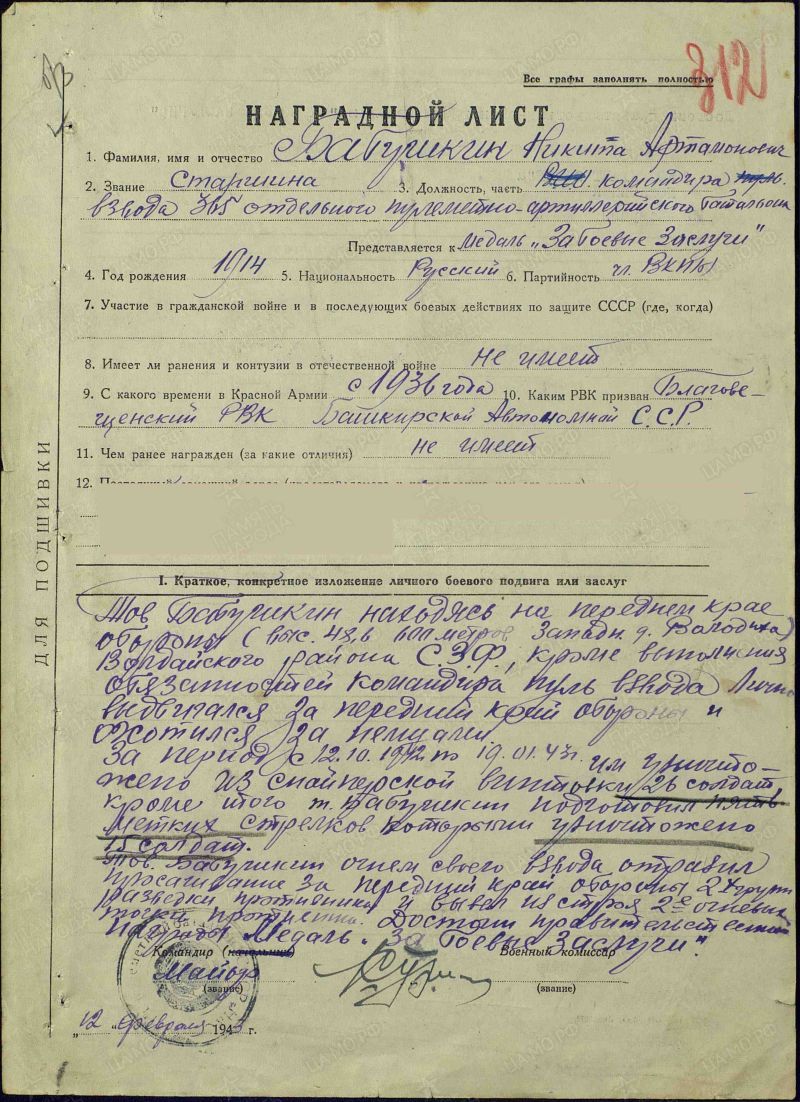 Тов. Бабушкин огнем своего взвода отразил просачивание за передний край обороны 2-х групп разведки противника и вывел из строя 2-е огневые точки противника. Достоин правительственной награды медаль" За боевые заслуги". Майор/ / 12.02.1943 г.