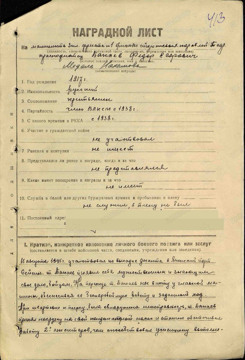 Прошёл всю Великую Отечественную войну. В августе 1945 учавствовал в операции по высадке десанта в японском порту Сейсин. За проявленное мужество в ходе этой сложной операции был награждён медалью Нахимова.