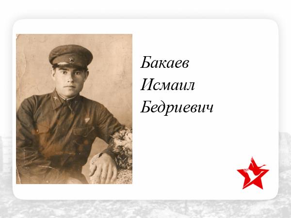 Бакаев Исмаил Бедриевич был командиром 76 мм. пушек войсковой артиллерии в 532 стрелковом полку. Был легко ранен в правую голень в апреле 1945 года. Попал 2132 эвакогоспиталь на излечение (апр. 1945- ноя. 1945). Демобилизован 15 ноября 1945 года на основании указа президиума ВС СССР от 28.09.1945г.