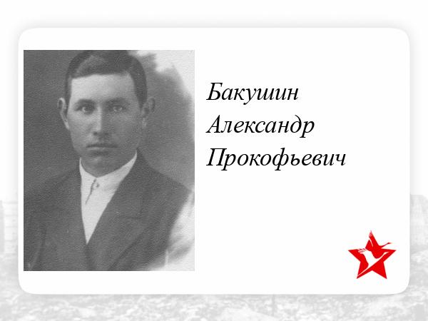 Александр Прокофьевич Бакушин был призван на фронт в 1942 г. Тяжело раненым попал в плен 14.06.1942 г. в районе д. Жуково, Старо-Русского района, Ленинградской обл. Бежал из плена, но был пойман в результате донесения о нем в немецкую комендатуру местным населением (Польша). Освобожден из плена 30.05.1945, продолжал участвовать в сражениях с разрозненными не капитулировавшими отрядами немецких войск и националистов (Польша, Украина), вернулся домой в декабре 1945 г.