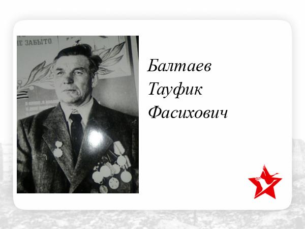 Когда началась война Тауфик Балтаев был семнадцатилетним парнем. Подростки, старики, женщины стали основной силой в колхозе. Тауфик Фасихович был одним из тех, кто нёс на плечах тяжесть труда военных лет. В 1942 году ему исполнилось восемнадцать. Пришла пора идти в армию. Балтаев Тауфик Фасихович 1924 года рождения, воевал в 1-м Белорусском фронте (Витебск, Орша, Варшава, Берлин). На полях сражений Тауфик Фасихович показал себя храбрым воином. Был несколько раз ранен. В 1942 году награждён орденом "Отечественной войны", медалями - "За отвагу", "За Варшаву", "Жукова", "За взятие Берлина"... Участник Великой Отечественной войны с 1942 по 1945. Службу продолжал в Берлине 1946-1947 гг. Приехал в родную деревню ТЮНДЮК 1947г. Если солдату Гитлеровской армии пришлось шагать по улицам Москвы,как пленнику, то ТЮНДЮКОВСКИЙ парень и советский солдат ТАУФИК БАЛТАЕВ вошёл в Берлин победителем