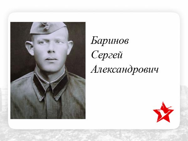 Баринов Сергей Александрович родился в Ярославской области, Пошехонском районе, деревне Леушино. После того, как Волгу отправили в новое русло, переехал в деревню Кременево. Был женат на Бариновой Марии Ивановне. Воевал на “Финской” войне, имел двоих дочерей, работал в колхозе. Был призван на фронт в первые дни Великой Отечественной войны, а именно 26.06.1941г. По имеющимся в семье документам мы знаем, что он пропал без вести в ноябре 1941г. Отец мой родился в январе 1942 г., третий ребенок у бабушки. Предположительно пропал без вести под Смоленском, точной информации нет.