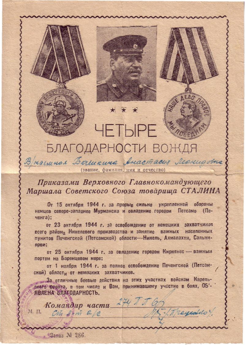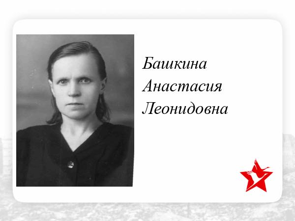 Их армия освобождала города Петсамо (Печенга), Киркенес, важный порт в Баренцевом море, полностью освободила Печенгскую область от немецких захватчиков. Прачечно-дезинфекционный отряд всё время двигался вслед за передовой линией фронта, в 2 – 3 км от неё. Солдаты между боями, приходя в отряд с передовой, мылись в передвижной бане, меняли бельё и одежду, посещали парикмахера, покупали продукты в военторговской лавке. За участие в героической обороне Советского Заполярья указом Президиума Верховного Совета СССР от 5 декабря 1944 года Башкина Анастасия Леонидовна награждена медалью «За оборону Советского Заполярья», за участие в Великой Отечественной войне указом Президиума Верховного Совета СССР от 9 мая 1945 года – медалью «За победу над Германией в Великой Отечественной войне 1941 – 1945 гг.». После войны награждалась юбилейными знаками, медалями и Орденом Отечественной войны II степени в ознаменование победы советского народа в Великой Отечественной войне 1941 – 1945 годов.
