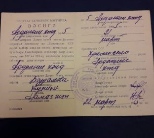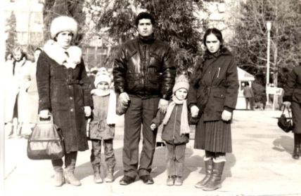 ... В тяжелые годы войны молодая Гюльшан оставшаяся одна с тремя детьми и несмотря на трудности судьбы, она смогла вырастить достойных, физически и морально здоровых детей. Трудолюбивая моя бабушка сама шила им одежду. Но и не только, во время войны она трудилась в тылу. "Все Для Фронта!", "Все Для Победы!" - с этими девизами и лозунгами жила моя преданная бабушка. День и ночь трудилась в колхозе, занималась скотоводством и сельскохозяйственной работой. Занималась выращиванием зерна, с помощью молотилки выколачивала зерна из колосьев, косила траву, бурьян и сорняки. Собирала сено в стога, а сухую солому в тюки. Но вот, после возвращения с тяжелой работы, вся уставшая молодая Гюльшан бралась за другую должную работу. Каждую ночь она вязала шерстяные носки и варежки для фронта. Ведь моя бабушка была умелой рукодельницей. Она была умелая вязальщица и портниха. Бабушка вязала абсолютно все и шила разные одежды разных фасонов. Для женщин бабушка шила платья, а для мужчин сорочки и рубашки. А то, что вязала моя бабушка Гюльшан для фронта, она считала своим долгом и обязанностью перед Родиной. Она знала, что связанные ею вещи согревали солдат, красноармейцев от холодной войны и если учесть, что среди этих солдат был и ее любимый муж и которого тоже грела ее связанная вещь. За самоотверженность, за доблестный труд в Великой Отечественной войне моя отважная бабушка была награждена орденом, многочисленными наградами и юбилейными медалями.