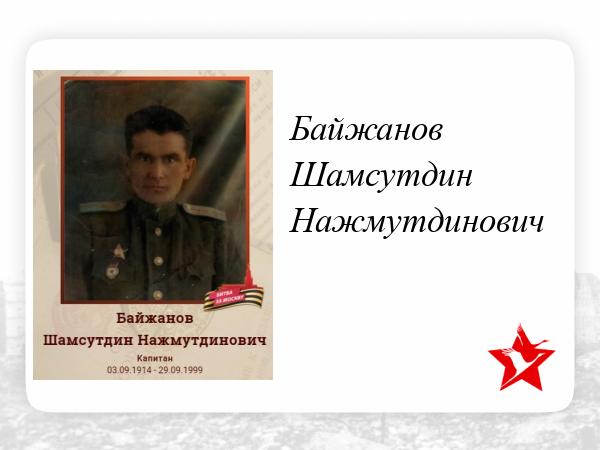 Участвовал в оборонительном сражении под Москвой и контрнаступлении советских войск под Москвой. Капитан Западного фронта. В 1942 г награжден Орденом “Красной Звезды”. В 1944 г медалью "За оборону Москвы" (1 отдельный стрелковый батальон). Также награжден Орденом Отечественной войны I ст.