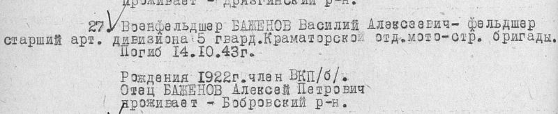 "Призывался Василий в г.Боброве. Погиб в 1943 году, по данным, снаряд попал в машину скорой помощи."