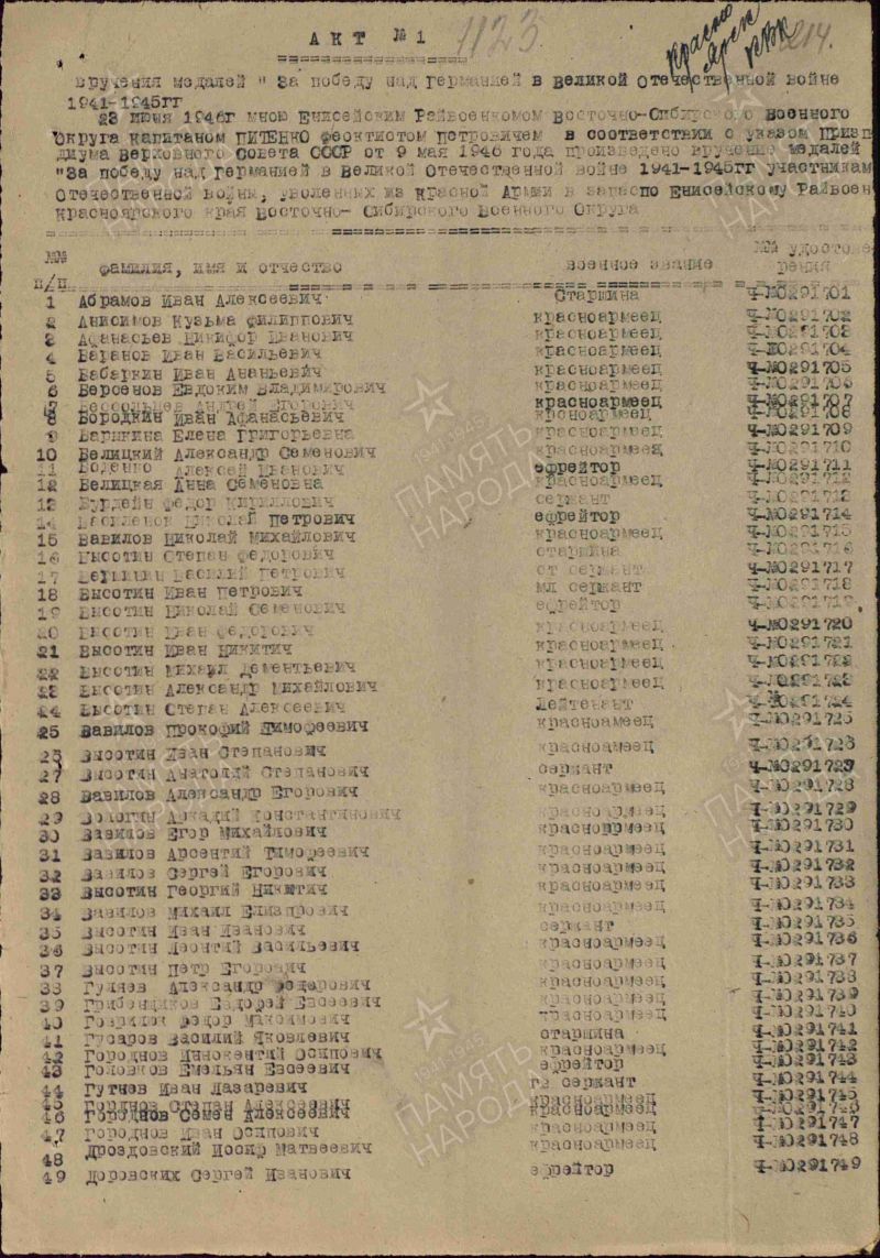 Белицкий Александр Семенович, 1909 г. р. Место рождения Красноярский край, Енисейский район, д. Кривляк. Призван Енисейским РВК в 1941 году. Красноармеец. Стрелок. В/ч 901 сп 245 сд., 898 сп 245 сд. Ранен в апреле 1943 года. ЭГ 1026 (по справочнику Солдат. ру дислокация г. Архангельск). Награждён медалью За Победу над Германией в Великой Отечественной войне 1941-1945 гг. Умер в 1980 году.
