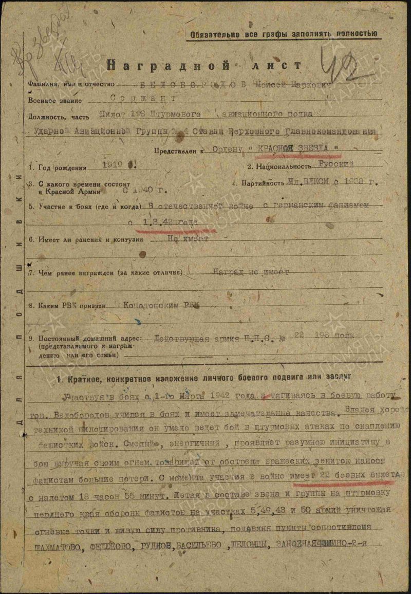 Младший лейтенант БЕЛОБОРОДОВ МОИСЕЙ МАРКОВИЧ, 25.08.1919 года рождения, место рождения - Украинская ССР, Сумская область, Конотопский район, г. Конотоп, еврей. В РККА призван Конотопским РВК, Конотопского района, Сумской области, Украинской ССР, 04.1940 года и направлен на учёбу в Чугуевскую военную авиационную школу пилотов. В Великой Отечественной войне с 1.03.1942 года, в должности (последняя): Командира звена 3 авиационной эскадрильи 198 штурмового авиационного полка, 233 штурмовой авиационной дивизии, 1 воздушной армии, Западного фронта. Боевые награды: 1. Орден "КРАСНОЙ ЗВЕЗДЫ" (06.1942). 5.08.1942 года, не вернулся, с боевого задания из района населённого пункта Кошелево, южнее, 10 км., г. Зубцов, Калининской области, РСФСР. Пропал без вести. Из "ЖУРНАЛА БОЕВЫХ ДЕЙСТВИЙ" 198 шап (ЦАМО, фонд 198 шап, опись 223156, дело 1): "5.08.1942 года произведен вылет пары Ил-2 : 1. Командир экипажа заместитель командира 3 авиационной эскадрильи 198 шап лейтенант ПУШКАРЁВ МИХАИЛ АЛЕКСЕЕВИЧ (29.10.1921 - ?), на месте стрелка - радиста военком эскадрилии старший политрук (капитан) ПИЦХЕЛАУРИ МИХАИЛ АЛЕКСАНДРОВИЧ (1915 - ?); 2. Младший лейтенант Белобородов М. М. По показаниям экипажа лейтенанта Пушкарёва М. А. - Пицхелаури М. А., младший лейтенант Белобородов М. М. был подбит Ме-109, загорелся, в воздухе, и упал на территорию занятую противником, в районе населённого пункта Ванмирово.".