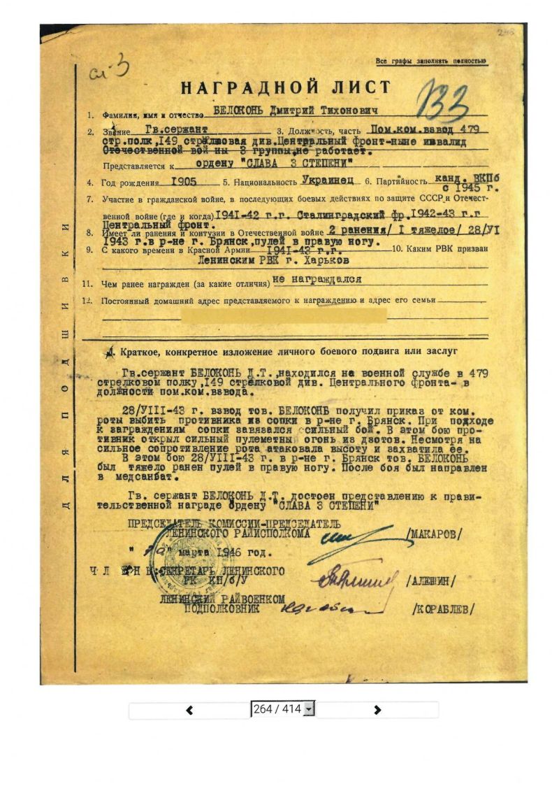 Дедушка, Белоконь Дмитрий Тихонович 07.11.1905 г.р. Гвардии сержант, помощник командира взвода 479 стрелкового полка, 149 стрелковой дивизии, Центральный фронт. В августе 1943 г. в бою в районе г. Брянск был тяжело ранен. Инвалид Великой Отечественной Войны. Кавалер Ордена Славы 3 степени.