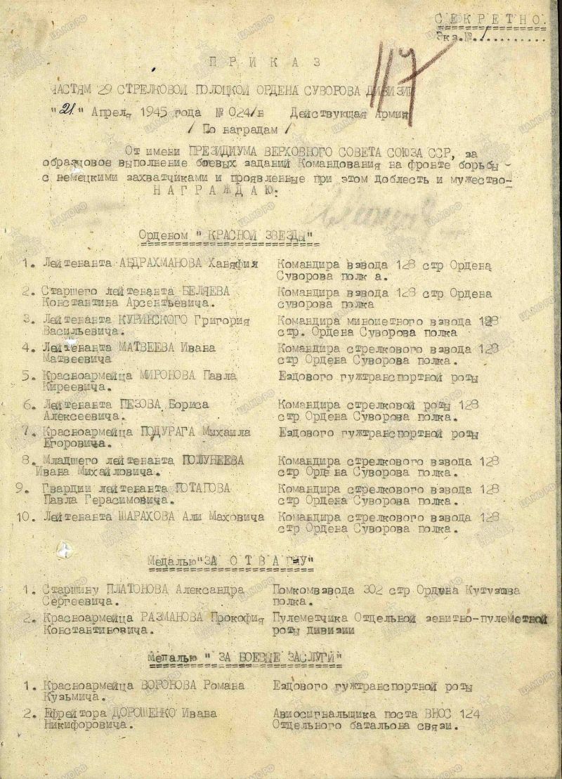 Место рождения: Ленинградская обл., г. Ленинград 01.01.1922 Место призыва: Василеостровский РВК, Ленинградская обл., Василеостровский р-н 01.01.1940 Боевые действия в составе: 128 сп 01.07.1941 - 31.08.1941 Орден Красной Звезды 14.10.1941 - 14.10.1941 Боевые действия в составе: 128 сп 27.07.1942 - 29.07.1942 Боевые действия в составе: 128 сп 15.08.1942 - 17.08.1942 Боевые действия в составе: 128 сп 27.08.1942 - 31.08.1942 Боевые действия в составе: 128 сп 14.01.1943 - 14.01.1943 Боевые действия в составе: 128 сп 07.06.1943 - 07.06.1943 Боевые действия в составе: 128 сп 07.06.1943 - 12.06.1943 Боевые действия в составе: 128 сп 12.06.1943 - 15.06.1943 Боевые действия в составе: 128 сп 16.06.1943 - 02.07.1943 Боевые действия в составе: 128 сп 13.07.1943 - 14.07.1943 Боевые действия в составе: 128 сп 15.07.1943 - 15.07.1943 Боевые действия в составе: 128 сп 29.07.1943 - 03.08.1943 Боевые действия в составе: 128 сп 10.08.1943 - 10.08.1943 Боевые действия в составе: 128 сп 14.08.1943 - 15.08.1943 Боевые действия в составе: 128 сп 20.08.1943 - 20.08.1943 Боевые действия в составе: 128 сп 22.08.1943 - 22.08.1943 Боевые действия в составе: 128 сп 24.08.1943 - 25.08.1943 Боевые действия в составе: 128 сп 31.08.1943 - 31.08.1943 Боевые действия в составе: 128 сп 03.09.1943 - 03.09.1943 Боевые действия в составе: 128 сп 13.09.1943 - 13.09.1943 Боевые действия в составе: 128 сп 16.09.1943 - 19.09.1943 Боевые действия в составе: 128 сп 26.09.1943 - 26.09.1943 Боевые действия в составе: 128 сп 28.11.1943 - 28.11.1943 Боевые действия в составе: 128 сп 22.12.1943 - 22.12.1943 Боевые действия в составе: 128 сп 23.12.1943 - 23.12.1943 Боевые действия в составе: 128 сп 24.12.1943 - 26.12.1943 Боевые действия в составе: 128 сп 27.12.1943 - 27.12.1943 Боевые действия в составе: 128 сп 04.01.1944 - 04.01.1944 Боевые действия в составе: 128 сп 16.01.1944 - 16.01.1944 Боевые действия в составе: 128 сп 23.01.1944 - 23.01.1944 Боевые действия в составе: 128 сп 06.03.1944 - 12.03.1944 Боевые действия в составе: 128 сп 06.05.1944 - 06.05.1944 Боевые действия в составе: 128 сп 15.07.1944 - 18.07.1944 Боевые действия в составе: 128 сп 03.08.1944 - 10.08.1944 Боевые действия в составе: 128 сп 19.08.1944 - 19.08.1944 Боевые действия в составе: 128 сп 24.08.1944 - 24.08.1944 Боевые действия в составе: 128 сп 25.08.1944 - 26.08.1944 Боевые действия в составе: 128 сп 26.08.1944 - 26.08.1944 Боевые действия в составе: 128 сп 27.08.1944 - 27.08.1944 Боевые действия в составе: 128 сп 18.09.1944 - 20.09.1944 Боевые действия в составе: 128 сп 26.09.1944 - 01.10.1944 Боевые действия в составе: 128 сп 03.10.1944 - 03.10.1944 Боевые действия в составе: 128 сп 08.10.1944 - 08.10.1944 Боевые действия в составе: 128 сп 13.01.1945 - 17.01.1945 Боевые действия в составе: 128 сп 01.02.1945 - 01.02.1945 Боевые действия в составе: 128 сп 06.02.1945 - 06.02.1945 Боевые действия в составе: 128 сп 15.02.1945 - 15.02.1945 Боевые действия в составе: 128 сп 25.02.1945 - 26.02.1945 Боевые действия в составе: 128 сп 20.03.1945 - 20.03.1945 Боевые действия в составе: 128 сп 22.03.1945 - 25.03.1945 Боевые действия в составе: 128 сп 27.03.1945 - 31.03.1945