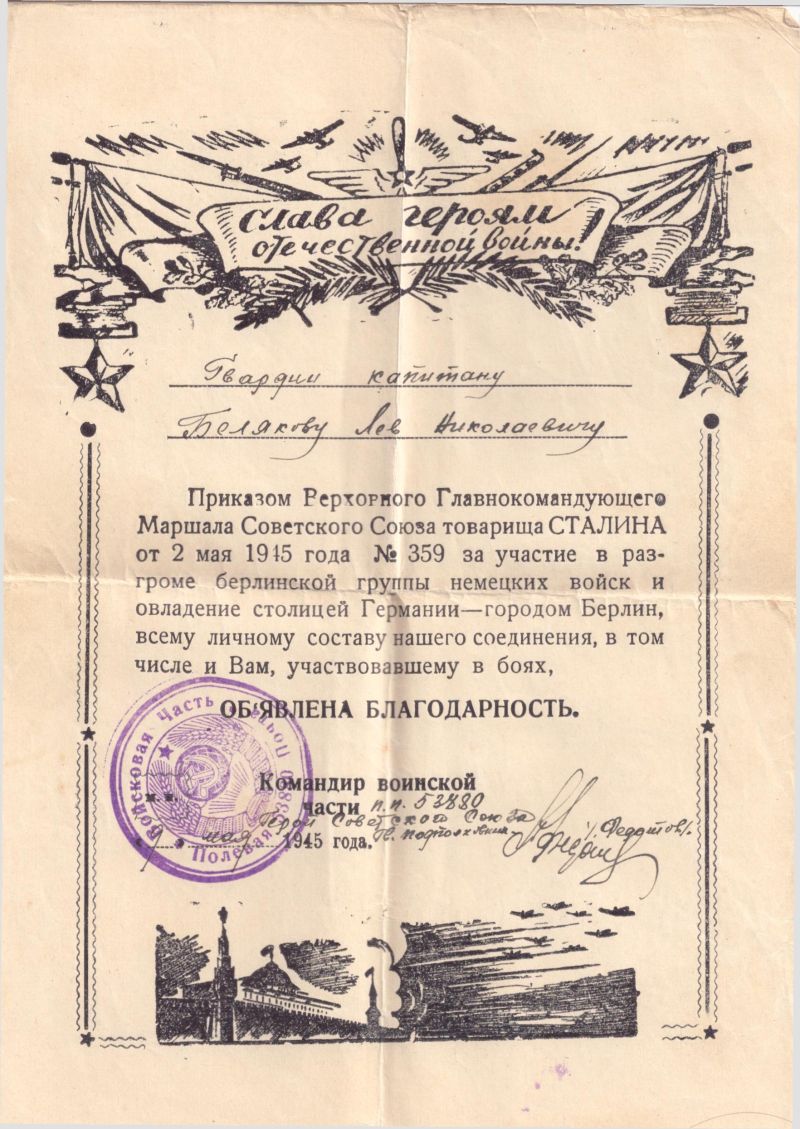 Лев Николаевич, родился в 1910 г. в г. Москва. Закончил Московский технологический институт им. Кагановича в мае 1941 года. В июне 1941 года добровольцем ушел в ряды Советской армии. Прошел всю войну. До 1943 года был начальником химической службы 95 Гвардейского Штурмового авиационного полка. С 1943 года занимал должность начальника оперативно-разведывательной части 95 Гвардейского Штурмового авиационного Рава-Русского Краснознаменного полка. Удостоен семью правительственными наградами: Орден Красной звезды, медаль "За боевые заслуги", медаль "Отечественной войны II степени", медаль "За взятие Берлина", "За освобождение Праги", "За победу на Германией в Великой Отечественной Войне 1941-1945гг.", "За оборону Сталинграда". Демобилизовался в 1946 году. В 1946 году вернулся домой к жене и сыну, на свою прежнюю работу на Меховую фабрику №1