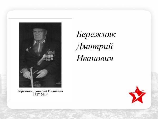 Бережняк Дмитрий Иванович, родился в 1927 году, умер 2014 году. Участник Великой Отечественной войны 1941-1945 годов.