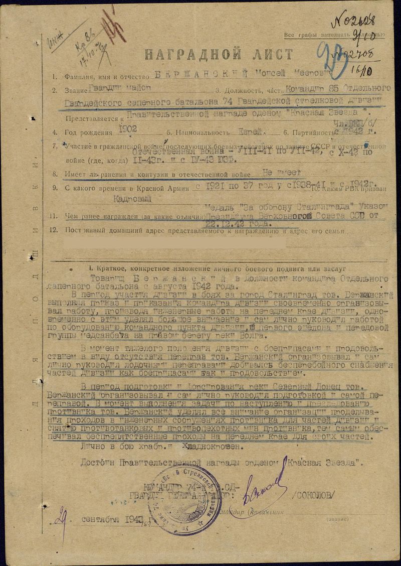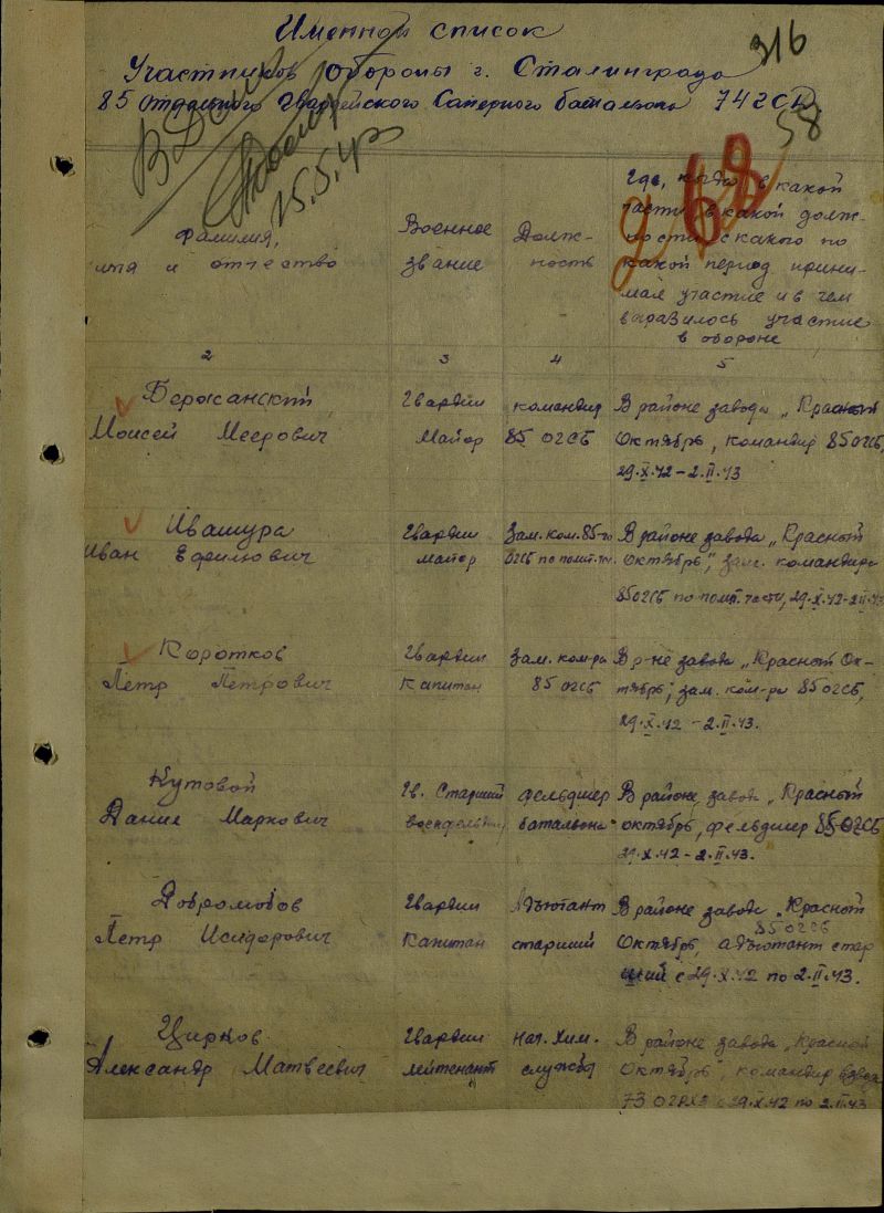 Командовал 52 осапб 62 Гвардейской стрелковой дивизии в период обороны Сталинграда. Территория завода Красный Октябрь. с 29.10.42 по 2.43 Сталинградский фронт.