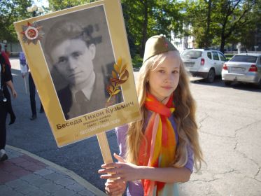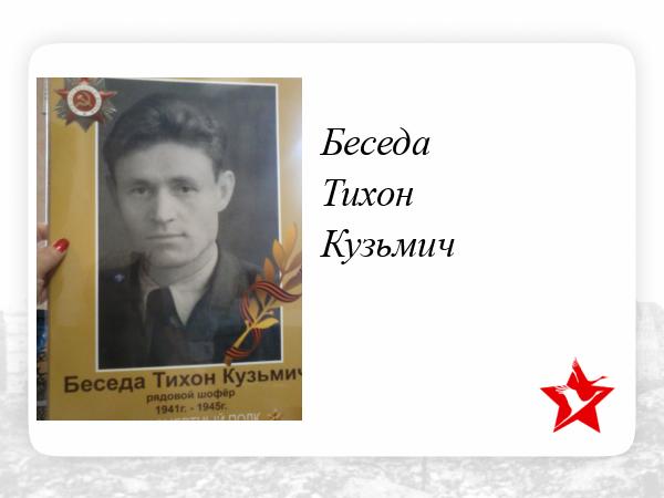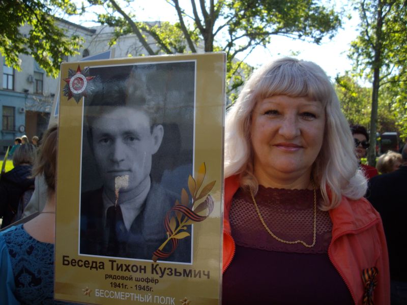 Мой дедушка родился в 1910 году в Ворошиловоградской области , Старобельский район, село Покровка. Был призван в Армию в 1932 г Голубевским Военкоматом, зачислен в 15 ый Артиллерийский полк, был рядовым Топ частей. На войну был мобилизован в 1941 ,в августе , в г. Архангельске . Так он попал в 374 ую Любанскую Краснознамённую Стрелковую Дивизию и прошёл с ней до октября 1945 года . Волховский фронт , Ленинградский фронт -- Ладожское озеро на полуторке по Дороге Жизни 152 дня под ежедневным обстрелом немцев он выполнил свой долг --- солдата- шофера . Только сейчас я понимаю что Это было Такое и как ему Повезло Выжить ! Потом Прибалтийский фронт , освобождали Прибалтику -- Ригу. Как мне сейчас жаль, что мы так мало спрашивали его об этом . А дед был очень скромным человеком -- так мало рассказывал, и фильмы о войне смотреть не мог почему-то. Он всё время ходил на парад 9 Мая и вот Мы хотим пройти с Ним в Бессмертном Полку !!!!!.Он был добрый, хороший, немного молчаливый, честный человек, нас с сестрой любил. Дед умер уже в мирное время в 1989 г, дождался и увидел правнучку, радовался. Очень любил рыбалку, каждый день утром ходил рыбу ловить на наше озеро или водохранилище . Спасибо Ему За Победу !