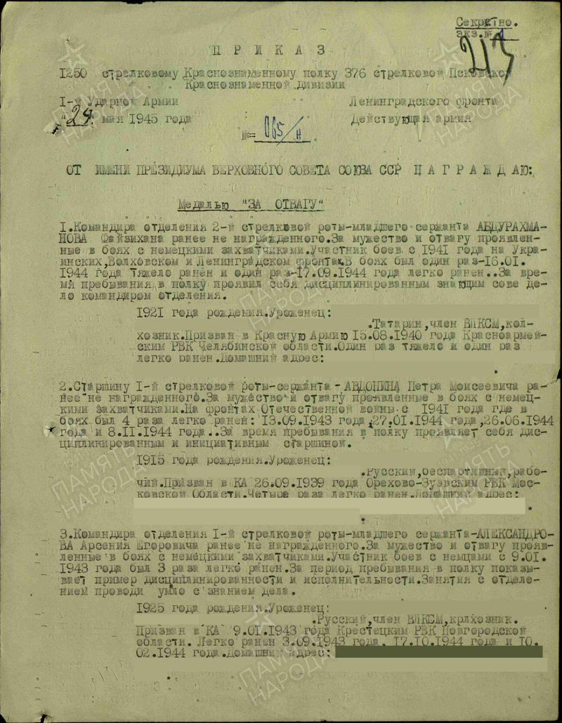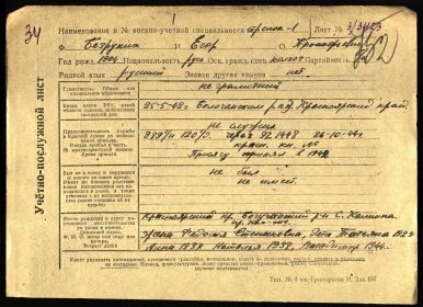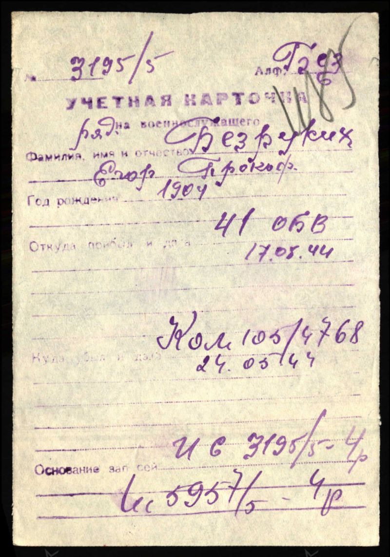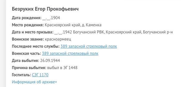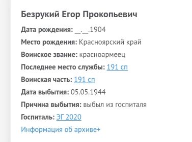 Безруких Егор Прокопьевич, 1904 г. р. Место рождения Красноярский край, Богучанский район, д. Каменка. Призван Богучанским РВК в 1942 году. Красноармеец. Стрелок. В/ч 389 сп 120 сд., 1267 сп 382 сд., 191 сп 201 сд., 1250 сп 376 сд. Трижды легко ранен. В июле 1943 ранен тяжело, эвакуирован в тыл. ЭГ 3412,2020,2017,263,1170,1448. После краткосрочного отпуска продолжил службу. Награждён медалью За отвагу. Жена Безруких Федосья Степановна. Дети Татьяна, 1929 г р., Анна, 1937 г р., Наталья, 1939 г р., Владимир, 1944 г р.