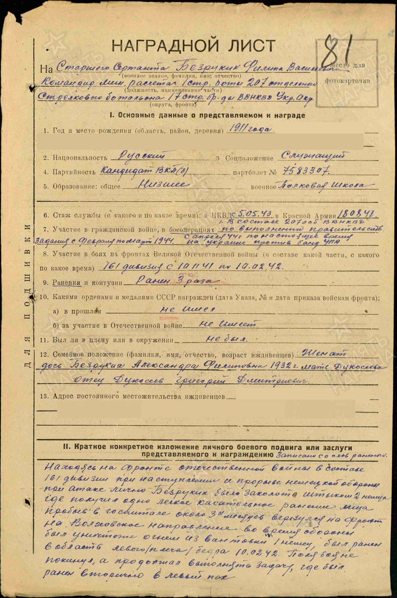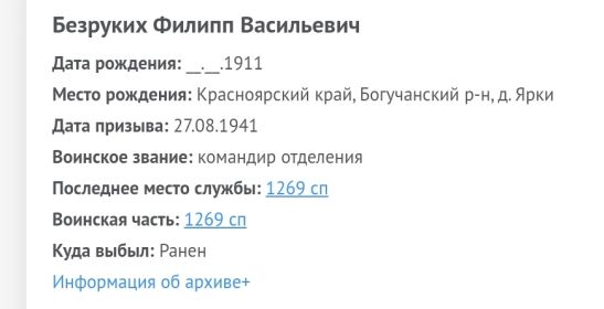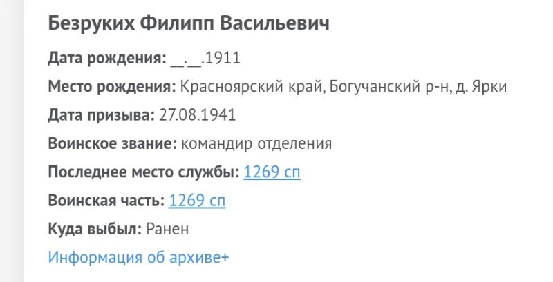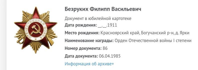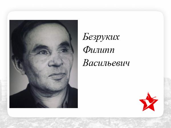 Безруких Филипп Васильевич, 1911 г. р. Место рождения Красноярский край, Богучанский район, д. Ярки.Призван Богучанским РВК в 1941 году. Ст. сержант. Командир миномётного расчёта. В/ч 161 сд., 1269 сп 382 сд., 207 осб 17 сбр ВВ НКВД Укр. окр. Трижды ранен. Награждён орденом Красной Звезды (6.08.1946), медалью За Победу над Германией в Великой Отечественной войне 1941-1945 гг., юбилейным орденом Отечественной войны 1 степени.