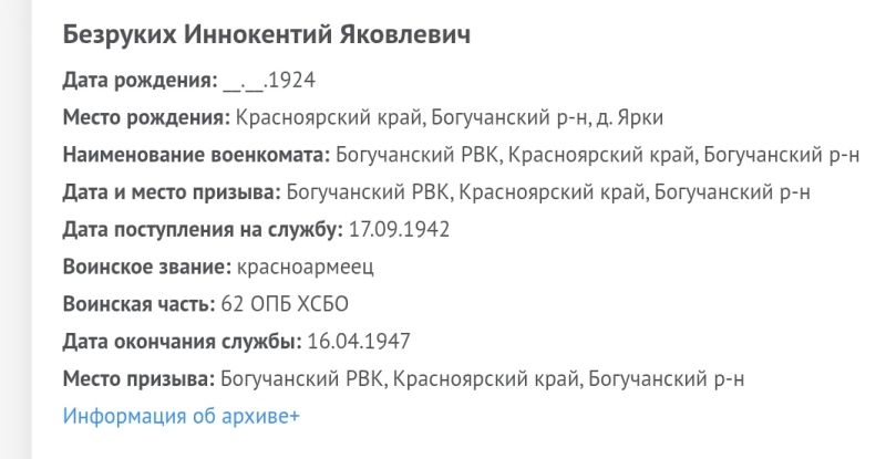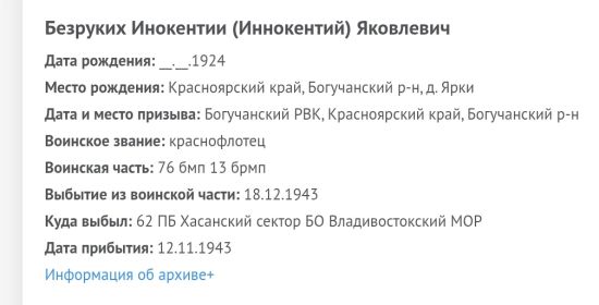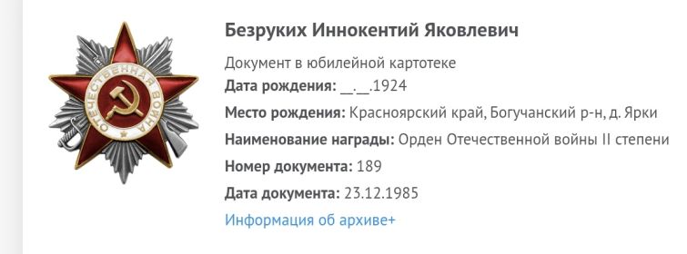 Безруких Иннокентий Яковлевич, 1924 г. р. Место рождения Красноярский край, Богучанский район, д. Ярки. Призван Богучанским РВК в 1942 году. Ефрейтор. Наводчик. В/ч 62 опулб ХСБО ТОФ. Награждён медалью За Победу над Японией, юбилейным орденом Отечественной войны 2 степени. Дата окончания службы 16.04.1947 года.