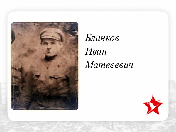 Блинков Иван Матвеевич (1901 - 1941), мой дядя, уроженец деревни Кулешовка Полетаевского района Тамбовской области, перед войной жил с семьёй в Подмосковье. Призван на фронт Реутовским РВК. На фронте был сапёром. Погиб в боях за Москву. По официальным документам - пропал без вести.