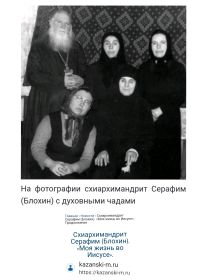 Схиархимандрит Серафим (Блохин)- автор духовных произведений: “Моя жизнь во Иисусе”, “Золотой клад или Путь в Царство Небесное”, “Что такое жизнь и как должно жить?”.