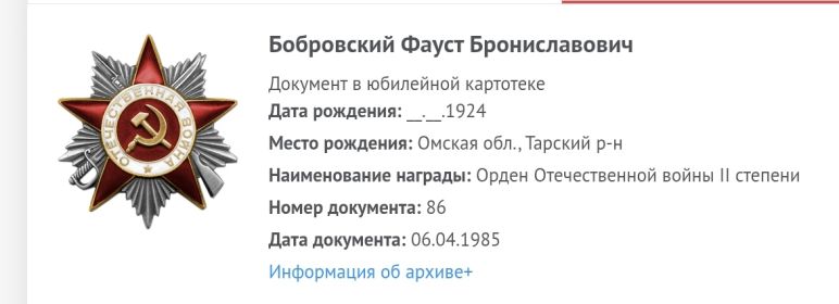Бобровский Фауст Брониславович, 1924 г. р. Место рождения Омская область, Тарский район, с. Нагорно-Ивановка. До войны жил в Красноярском крае, Богучанский район, с. Богучаны. Призван Богучанским РВК в 1942 году. Краснофлотец. Стрелок. В/ч ХС БО ТОФ. Участник войны с Японией. Дата окончания службы 16.04.1947 года. Награждён юбилейным орденом Отечественной войны 2 степени.