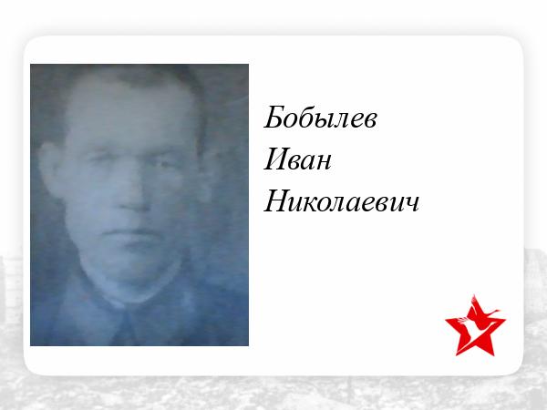 Мой дед,Бобылев Иван Николаевич,воевал с первых дней Великой Отечественной Войны.В середине 1941 года был тяжело ранен и после госпиталя был отпущен в отпуск домой на долечевание.Второй раз его призвали в начале 1942 года.Он был направлен в 58 гвардейский стрелковый полк 18 гвардейской стрелковой дивизии.В этом полку он воевал до конца 1943 года.Во время одной наступательной операции около Пустошки Псковской области в неравном бою с фашистами он пропал без вести.Я очень горжусь своим дедом и считаю его Героем!