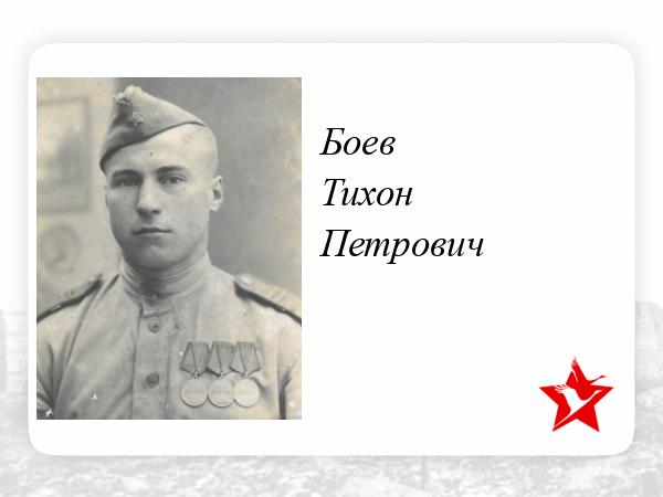 Боев Тихон Петрович, 06.01.1924 - 16.01.2004, село Курское Старооскольский р-н Белгородской области. Был призван на фронт в апреле 1943 года. Воевал на Ленинградском фронте, участвовал в освобождении городов: Нарва, Тарту, Таллин, Курессааре. На первом Украинском фронте участвовал в освобождении Польши. Победу встретил в Германии, в Берлине. Было присвоено звание младшего сержанта. Занимал должности: заряжающий миномётного стрелкового полка; танкист - наводчик; мотоциклист самоходной артиллерийской дивизии; командир отделения автомобильного батальона. Награждён тремя медалями за мужество и отвагу и медалью за победу над Германией. Уволен в запас 17.06.1950 года.
