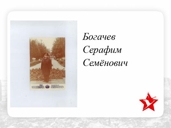 Родился в Воронежской области Калачеевского района д. Серяково 15.08.1926. 16-летним мальчишкой убежал из училища на фронт. Сначала подносил снаряды к орудиям под Севастополем. Воевал с ноября 1943 по сентябрь 1945 стрелком 1053 Стрелкового полка 300 СД Степного фронта. В 1945 году попал в Харбин, где был ранен в голову (сквозное ранение) и отправлен на излечение в госпиталь, после чего был комиссован. После ранения потерял слух на одно ухо, но закончил Ленинградский промышленный экономический техникум в 1962 году и 50 лет отработал машинистом тепловоза. Награжден медалью "За победу над Японией" 30.09.1945. Умер в 2009 году.